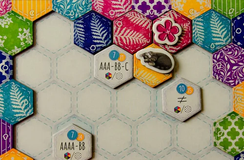 In calico, players place hexagonal quilt tiles to score points by making connected groups of patterns and colors.